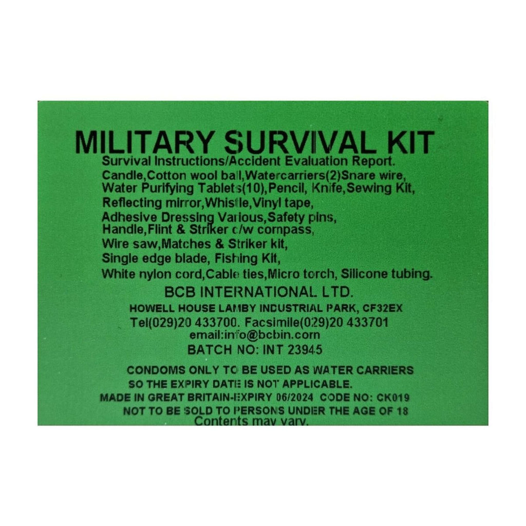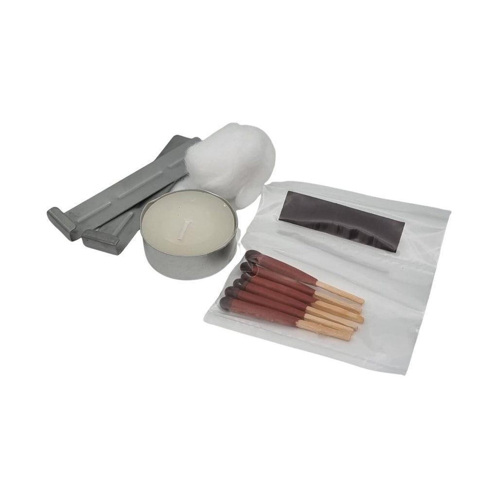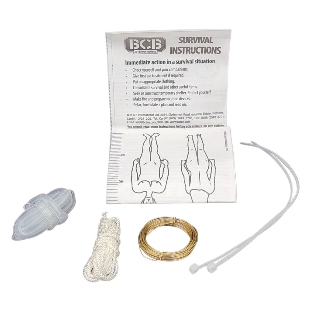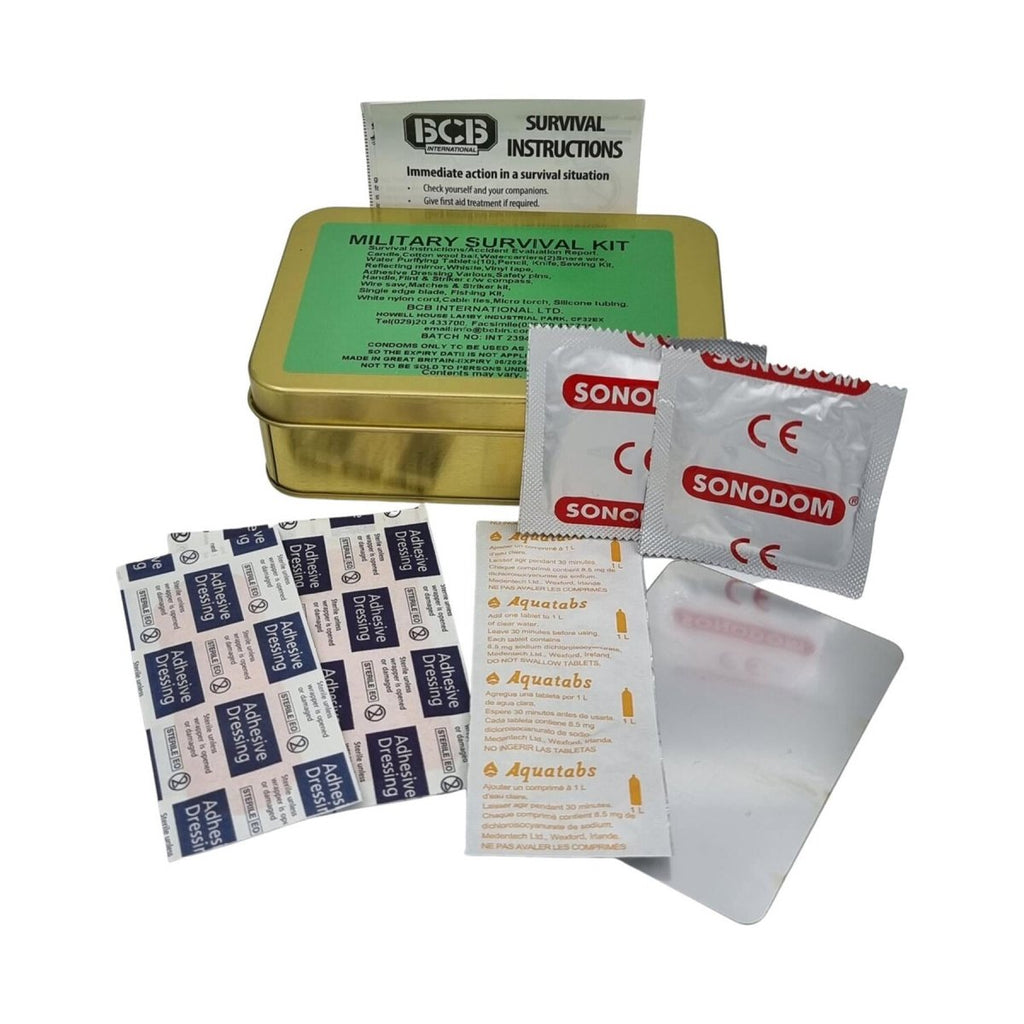 Das Set beinhaltet: wasserbeständige Dose, Vinylband, eine feststellbare Messerklinge, wasserfeste Streichhölzer und Schlaghammer, Bleistift, Wasserreinigungstabletten, Schlingendraht, Nachtlichtkerze, Feuerball-Feuerstein und Schlaghammer mit Knopfkompass, Angelset, Notpfeife, Nähset, Sicherheitsnadeln, einfache Drahtsäge, Signalspiegel, Hängegriff aus Blech, LED-Mikrotaschenlampe, Zunder-Wattebälle, einschneidige Rasierer, selbstklebende sterile Pflaster, nicht geschmierte Kondome (Wasserträger), Überlebensanweisungen, Formular zur Unfallbewertung.