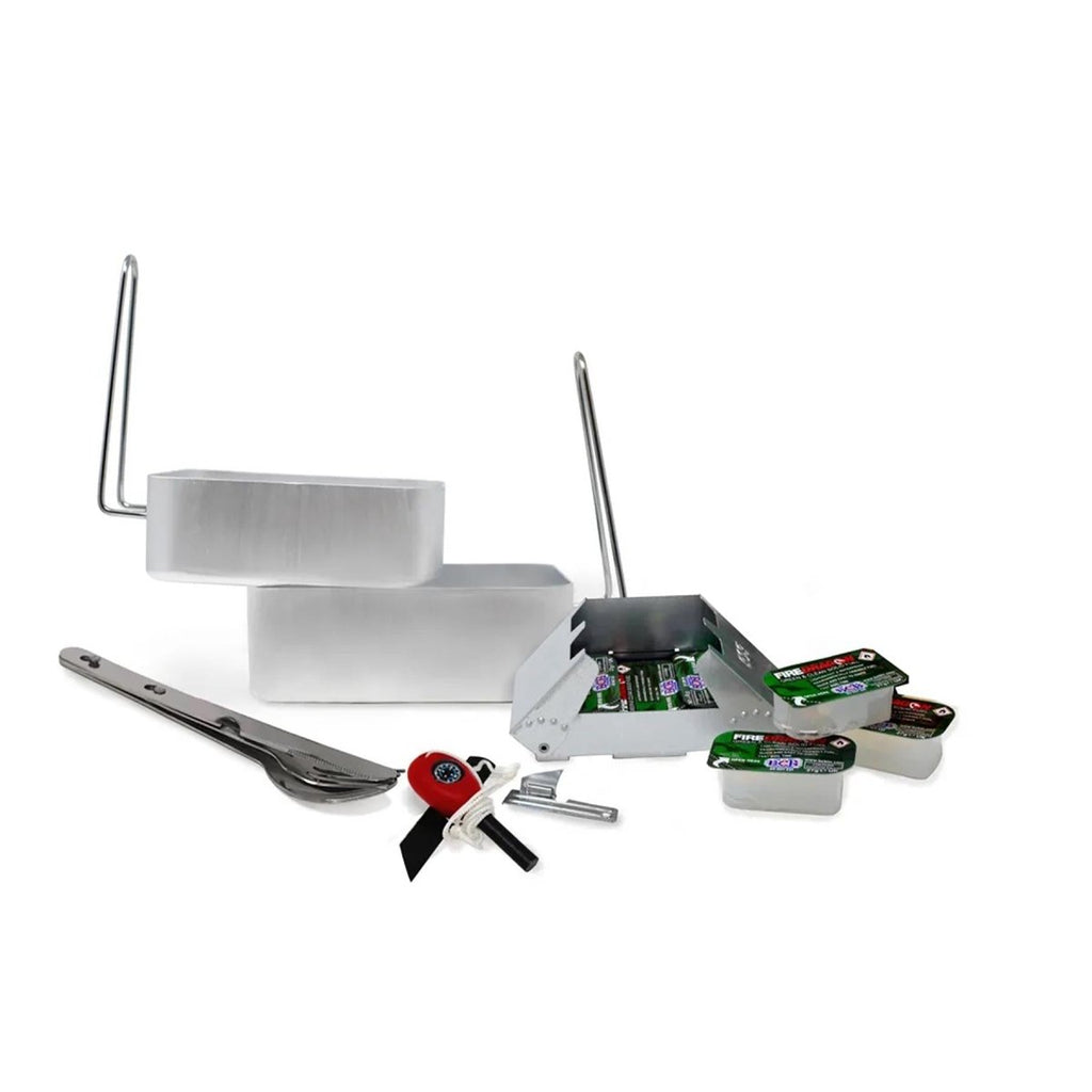 - SET INCLUDES : Herd, Messdosen, Besteckset, fester Kraftstoff, Dose Öffner, Feuerstein, Stürmer