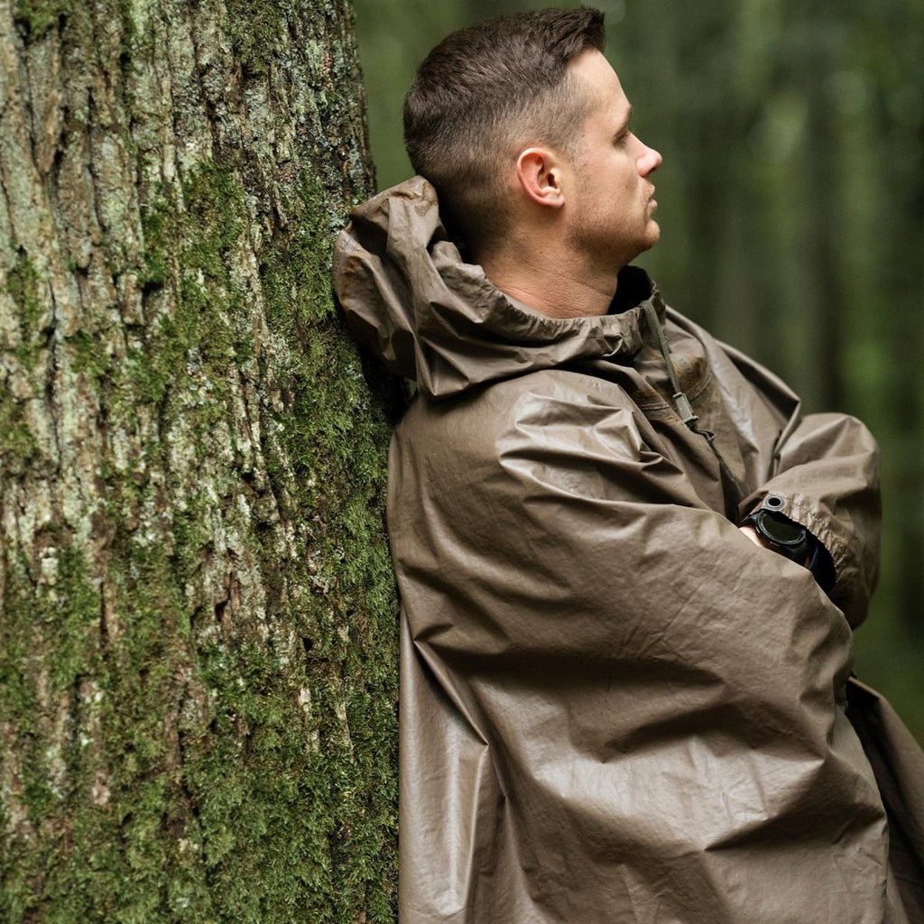 Ein deutscher Militärponcho mit Kapuze aus wasserdichtem Material, der den Träger vor Regen und anderen Elementen schützen soll. Die Kapuze bietet zusätzlichen Schutz für den Kopf und ist daher eine praktische Wahl für Outdoor-Aktivitäten und Feldeinsätze.