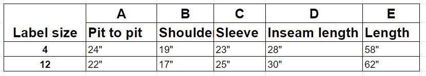 | Grube in Grube | Schultern | Ärmel | Innenlänge | Länge | |