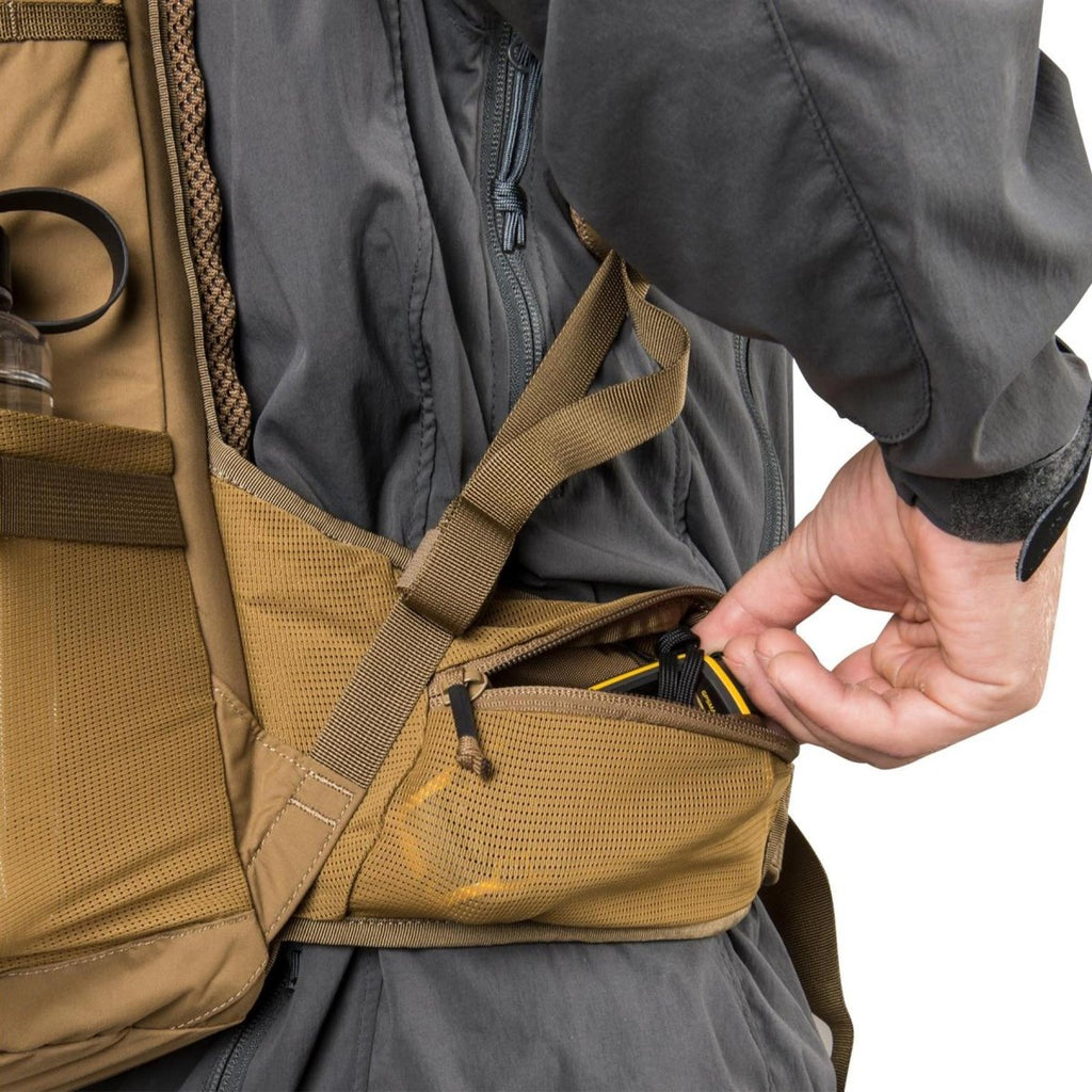 • Netztaschen am Hüftgurt eignen sich perfekt für Kleinigkeiten wie Snacks oder Schlüssel. Eine zusätzliche Tasche sorgt dafür, dass Ihre kleineren Utensilien organisiert und leicht zugänglich bleiben. Mit dem MOLLE Lite-Gurtband an den Seiten können Sie zusätzliche Taschen und Zubehör anbringen und so die Vielseitigkeit des Rucksacks erhöhen.