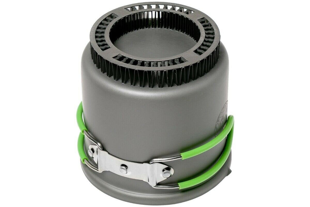 • Das Set umfasst langlebige, leichte Pfannen, die über einen Wärmetauscher für schnelleres und effizienteres Kochen verfügen. Diese Funktion verkürzt die Kochzeit, spart Gas und sorgt für eine gleichmäßige Wärmeverteilung. Mit diesem Kochsystem können Sie ganz einfach Mahlzeiten zubereiten. Und genießen Sie köstliches Essen, egal wo Sie sind.