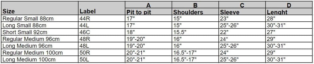 | Lange kleine 88 cm | 44L | 17" | 15" | 25"-26" | 30"-31" |