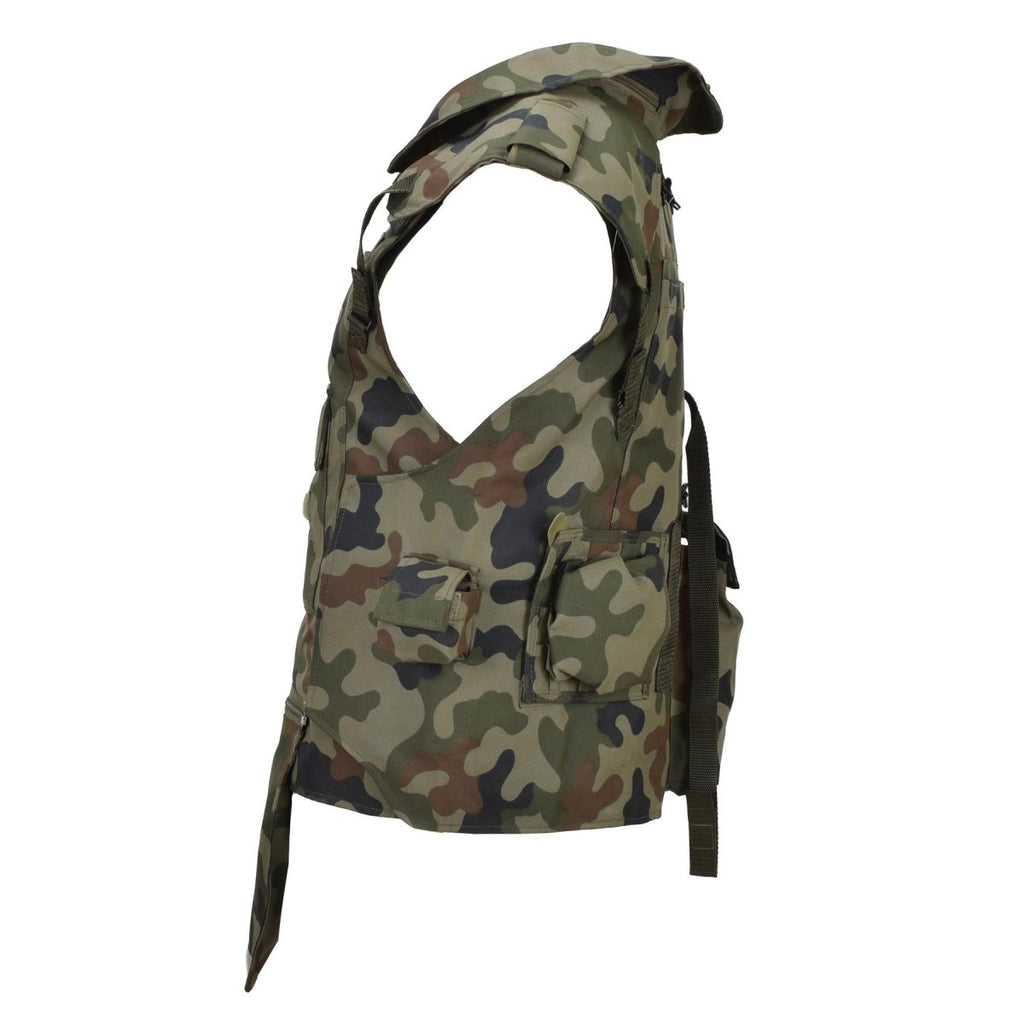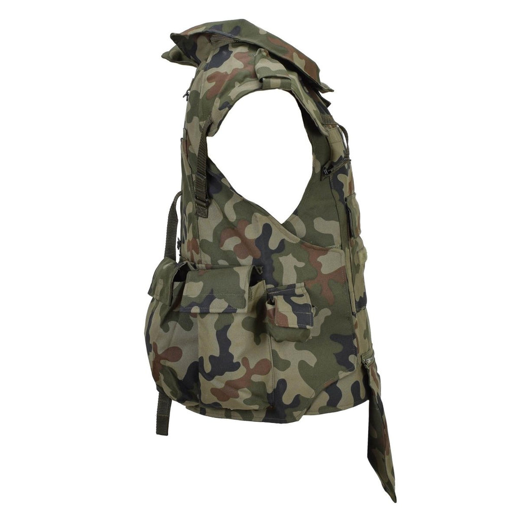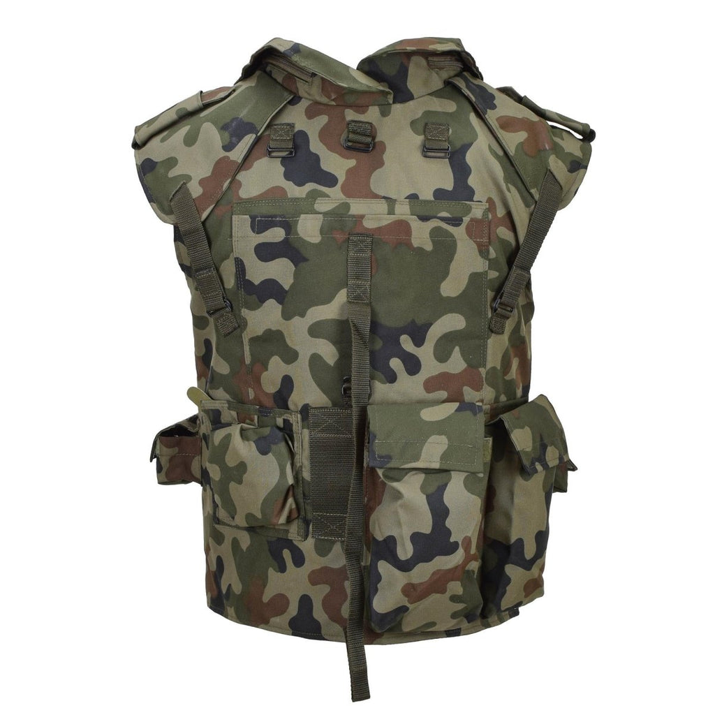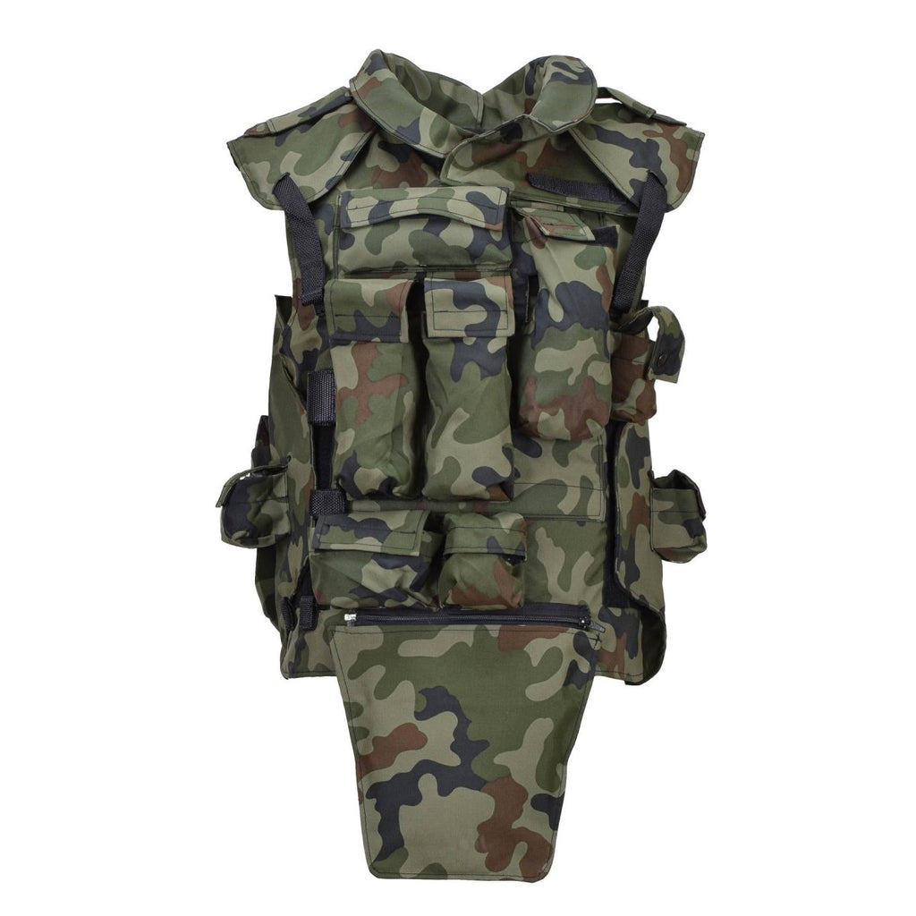 Diese original polnische Militär-Taktikweste ist zum Tragen von Platten konzipiert und besteht aus strapazierfähigem Polyester mit Woodland-Tarnmuster. Es umfasst mehrere Taschen zur Aufbewahrung der Ausrüstung, eine verstellbare Passform für mehr Komfort und einen Rettungsgriff für Notfallextraktionen. Erhältlich in zwei Varianten, die jeweils eine einzigartige Taschenkonfiguration bieten, um Ihren taktischen Anforderungen gerecht zu werden.