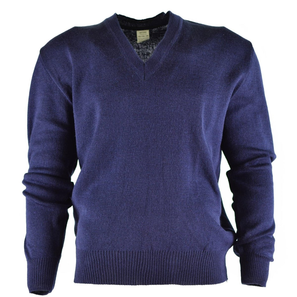 Der Military-Pullover aus überschüssiger Wolle ist ein wahres Beispiel für Qualität und Haltbarkeit. Dieser original blaue Wollpullover mit V-Ausschnitt der tschechischen Armee kombiniert Komfort mit Funktionalität und bietet eine zuverlässige Option für kälteres Wetter.
