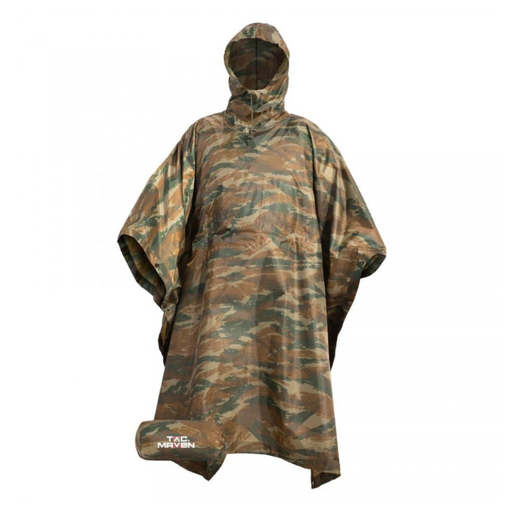 PENTAGON Wasserdichter Ripstop-Poncho mit verstellbarer Kapuze, Kompressionsrucksack, Eidechsen-Tarnung